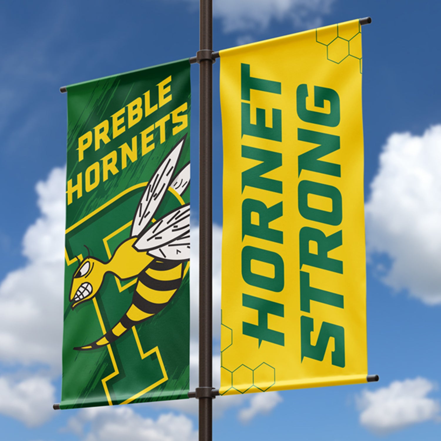 We can design and customize school branding to suit any size and layout. From a boldly branded entrance complete with custom door wraps, window film and light pole banners to stair graphics and locker wraps to foster the school spirit down every hallway. And when you do bring home the trophy, our championship banners will showcase your school’s pride and passion.